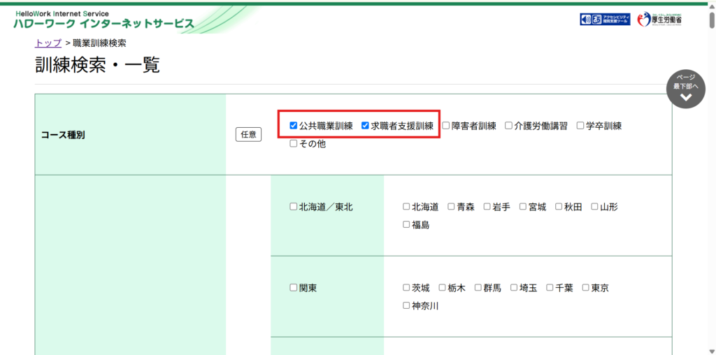 - 「公共職業訓練」と「求職者支援訓練」にチェックを入れる
