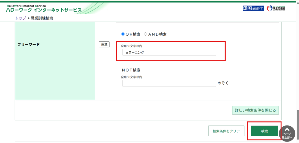(※公共職業訓練は雇用保険加入者向けですが、受講自体は非加入でも利用可能な場合があります。給付条件や支給額は異なるので、詳細はハローワークに確認しましょう。 - フリーワードに「eラーニング」と入力